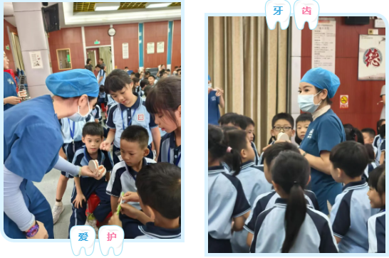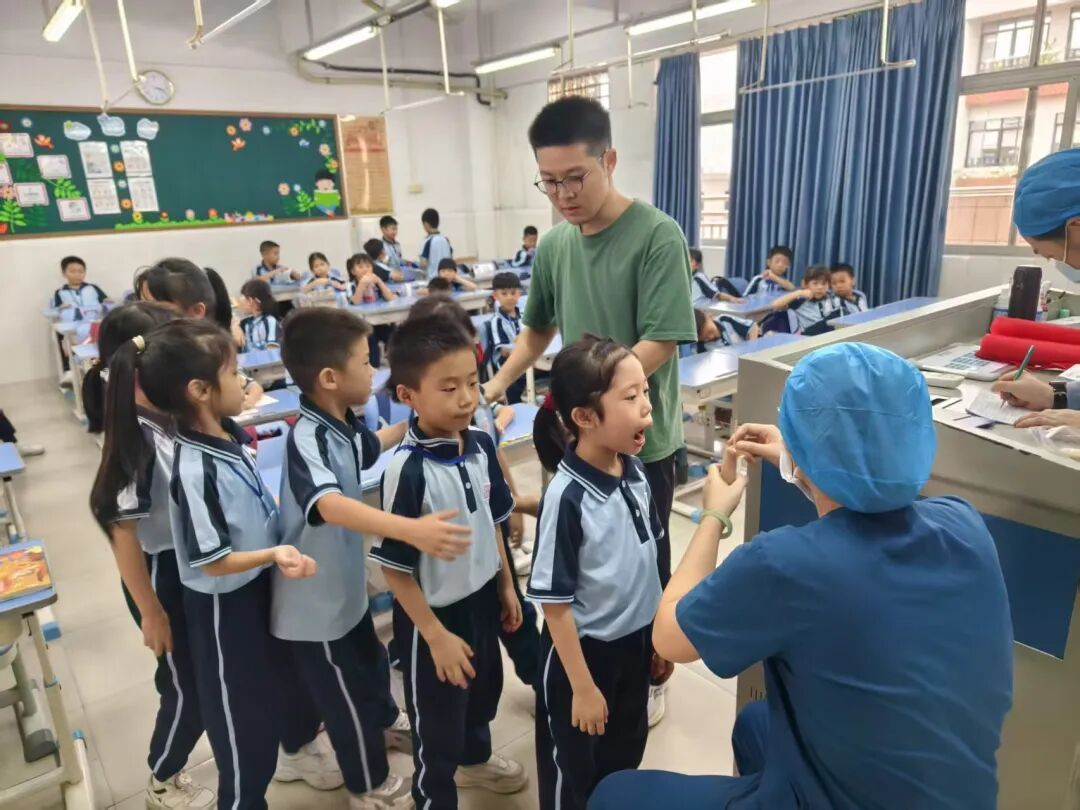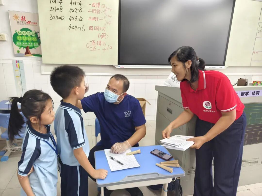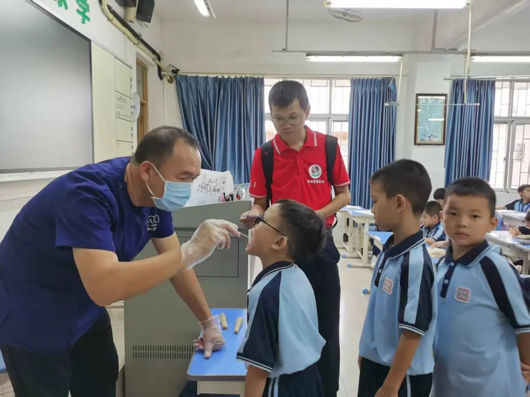 集体的分享和学习活动结束后,医师们分组进入各班,逐一细致地为每一个孩子检查牙齿,认真记录牙齿发育、龋齿等情况,为每位学生出具个性化护牙建议,还贴心地为每一个学生准备了健康卡和小礼品。