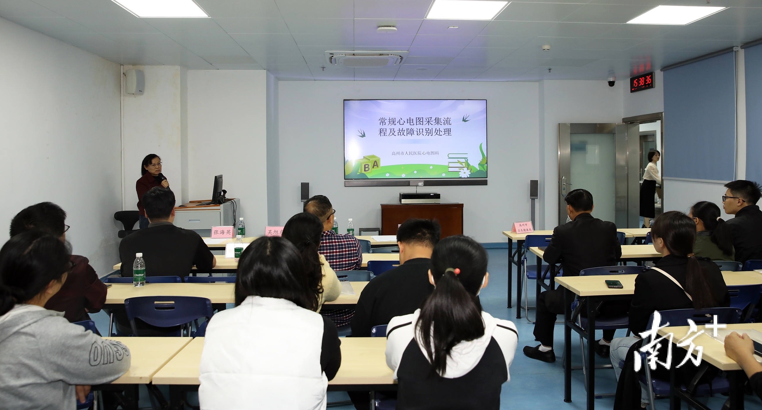 培训中,网络基层能力支持中心负责人吴旭东详细介绍了高州市人民医院区域心电信息管理系统平台的建设目标与功能;心电图科主任张海英系统讲解常规心电图的规范采集流程与常见故障识别处理,并“手把手”指导乡镇医护人员操作设备及上传数据与图样,切实提升其实际操作能力。